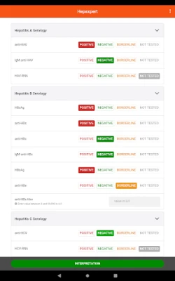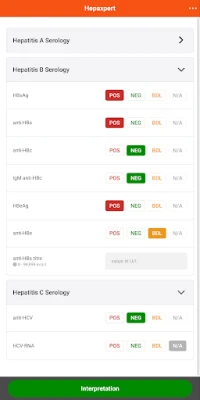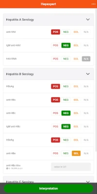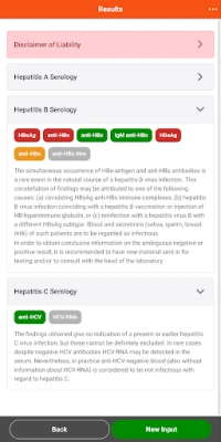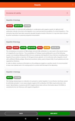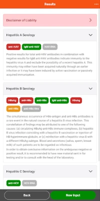 The interpretation is based on the qualitative test results for hepatitis A serology (anti-HAV, IgM anti-HAV, and HAV-RNA); the qualitative test results for hepatitis B serology (HBsAg, anti-HBs, anti-HBc, IgM anti-HBc, HBeAg, and anti-HBe) and the quantitative test result for anti-HBs titer; and the qualitative test results for hepatitis C serology (anti-HCV and HCV-RNA). The input is processed by HEPAXPERT’s extensive knowledge base which contains rule packages written in the Health Level Seven (HL7) International standard Arden Syntax. It has been carefully built and reviewed by laboratory and clinical specialists; its clinical value was confirmed by external experts, e.g., from Stanford University, amongst others. Decades of clinical and health-IT experience influenced the development process, producing an app with a clear and easy user interface backed by a body of reliable medical knowledge.