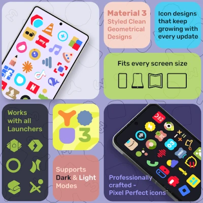 A: Unlike adaptive icons or generic packs, this one is shapeless, pastel-colored, and crafted using Material 3 design guidelines – making it unique, minimal, and professional.