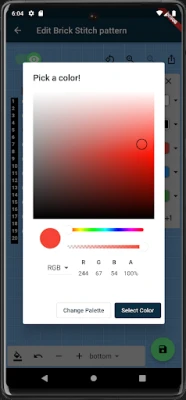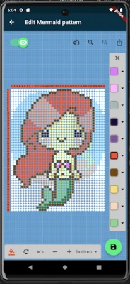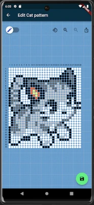 Editor of the patterns allows zoom the blueprints, select different color from the palette and gradient, change color of the single bead, row, column, whole blueprint or by swiping across the blueprint, remove some beads, add/remove row and coloms, rotate the image, undo the last action, reset image to the initial view.